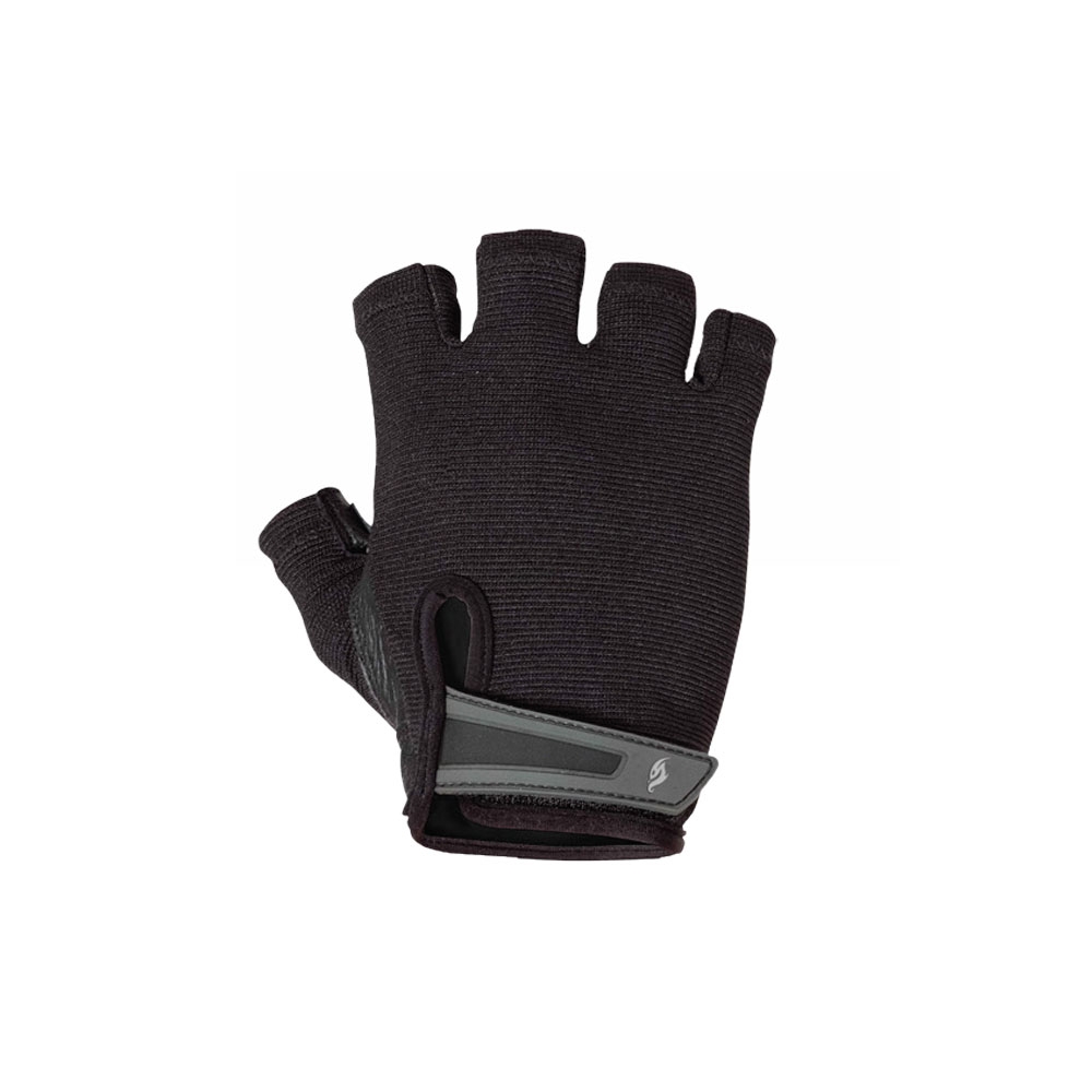 Pair of men's half-finger weightlifting gloves with leather palm and performance mesh for a flexible fit. Durable leather palm with open-cell foam cushioning provides durability 6 extra hand protection at key stress points: thumb is also leather reinforced StretchBack performance mesh on back of hand and between fingers provides flexibility, comfort. and breathability